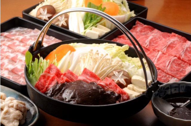 Prato que mistura vegetais e carnes em uma frigideira. A sopa para sukiyaki é um conjunto de molho de soja, mirin, saquê para cozinha, açúcar e água. Outros ingredientes incluem tofu, negi, hakusai (repolho chinês), e cogumelos. Ovo cru também é usado como molho para mergulhar a carne.