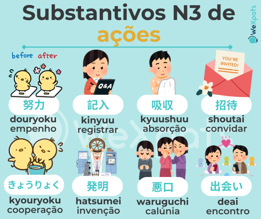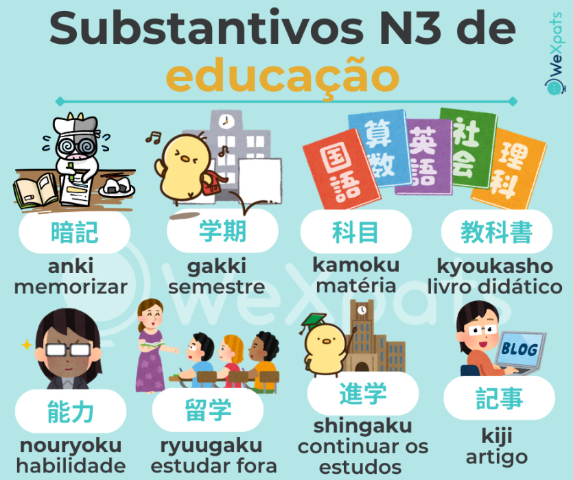 Nas listas de substantivos do nível N4 e N5, aprendemos substantivos simples usados no dia a dia. Na lista do N3, parte 1, vamos focar em três categorias - Trabalho; Educação e Ações. Na prova do N3, existem muitas questões com kanjis, então é importante decorá-los. Nessa parte vamos aprender 51 substantivos, focando em seus significados e como usá-los.