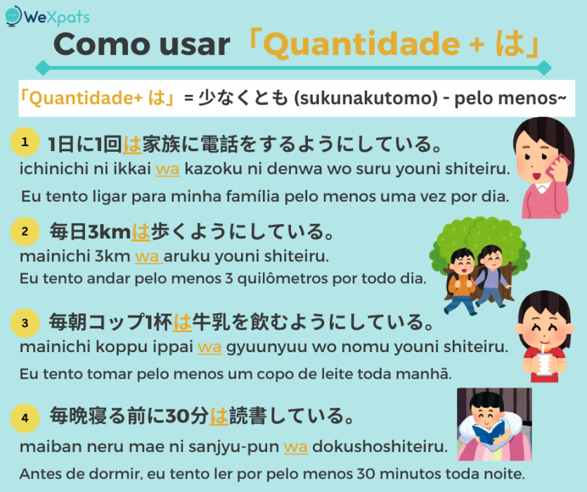 No N3, a partícula は (wa) pode ser usada para expressar quantidades. E é frequentemente usada para falar sobre hábitos ou ações importantes para o locutor. Lembrando que esse uso é diferente do は (wa) usado para indicar o sujeito de uma oração, como em 私は (watashi wa) - Eu sou.
