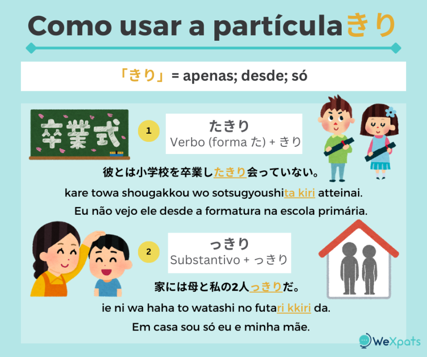 No nível N3, a partícula きり (kiri) é usada para limitar uma palavra, assim como para explicar os limites de uma situação do ponto em que きり (kiri) é usado até o tempo presente.