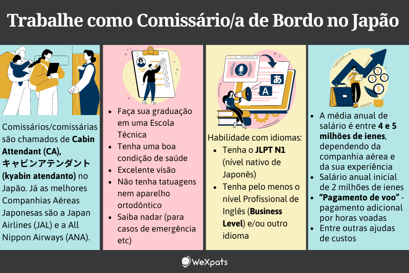 As companhias aéreas japonesas são conhecidas por serem uma das melhores do mundo, com comissários amigáveis que oferecem um serviço eficiente de alta qualidade. Caso esteja interessado em se tornar um comissário/a de bordo, você pode treinar no seu país de origem para se tornar uma atendente internacional e se candidatar para uma companhia aérea japonesa no aeroporto mais próximo. Sendo talvez necessário estudar o básico de Japonês, além de saber bem a Língua Inglesa.