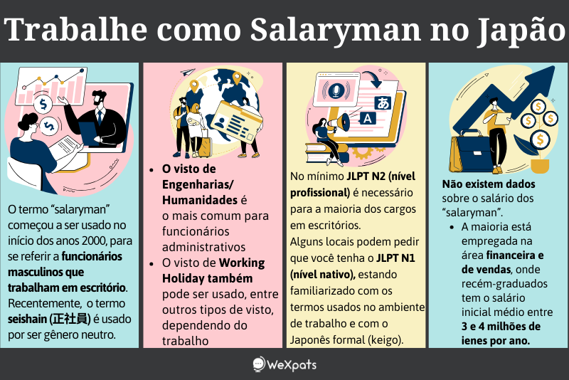 Geralmente salaryman japoneses trabalham em escritórios em diferentes áreas como finanças, manufatura, tecnologia e serviços.