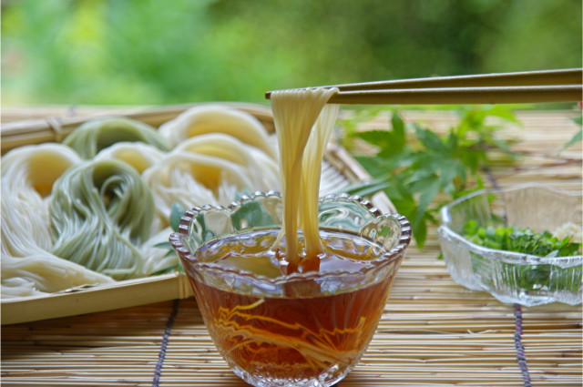 Macarrão de farinha de trigo branco bem fino, geralmente servido gelado, é muito refrescante, sendo popular durante o verão. O somen é resfriado após ser cozido e é servido para ser mergulhado em um molho chamado tsuyu, uma mistura de conserva seca de atum-bonito, gengibre e cebolinha.
