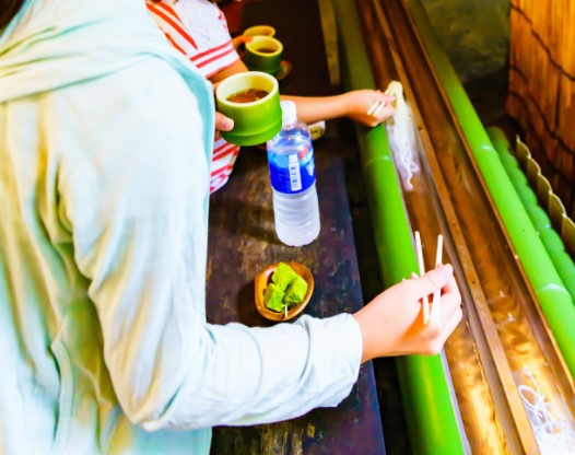 Nagashi somen, são macarrões colocados em longos bambus em que precisa pegá-los rapidamente com hashi enquanto estão passando.