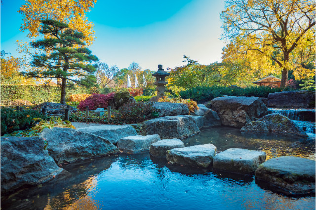 Certos elementos são obrigatórios na composição de um jardim japonês. É o caso das pedras, que são distribuídas de forma a sugerir que ali foram implantadas e desgastadas pela própria natureza, normalmente usadas em número ímpar.