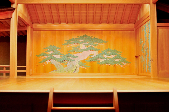 O palco nô tradicional é uma plataforma quadrada de cedro de mais ou menos 5,5 metros de largura com 3 lados abertos. Há quatro pilares de madeira, importante referência visual para o ator se posicionar no palco. O fundo do palco é sempre o mesmo, onde é pintado um grande pinheiro como símbolo da vida eterna.