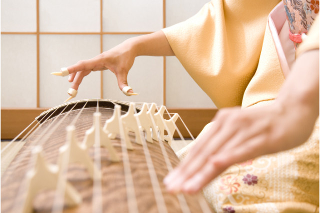 Instrumento de corda (foto acima), criado no período Nara (710 a 794 d.C). Seis cordas são colocadas na "caixa de ressonância", e uma “paleta” é colocada nos dedos para que o instrumento possa ser tocado.