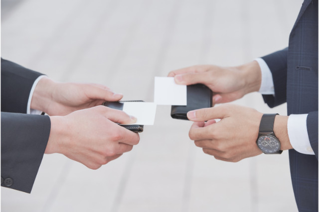 A troca de cartões de visita ocorre como uma saudação entre indivíduos que se conhecem pela primeira vez, e vão trabalhar juntos. Normalmente, a ordem é do funcionário da empresa que está recebendo o trabalho para a que está oferecendo o trabalho. Se deve dizer o nome da empresa e o próprio nome, em seguida uma reverência. Já quem recebe, deve aceitá-lo com as duas mãos.