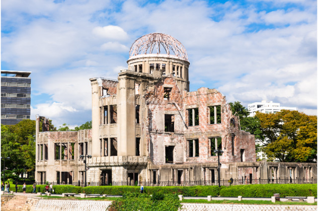 Cúpula da bomba atômica (原爆ドーム), era originalmente um local para venda de produtos regionais, porém em 1945, a bomba atômica jogada pelos militares americanos destruiu o prédio, tornando-o um marco de representação da crueldade da guerra. Se tornou um patrimônio em 1996.