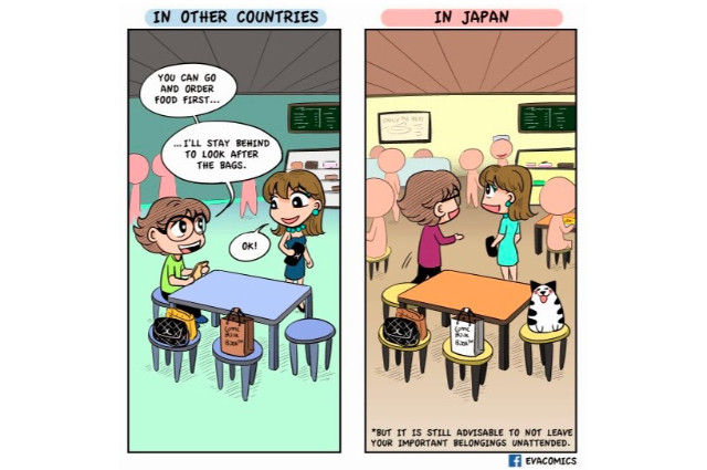 É sabido que o Japão é um país muito seguro, e isso vai desde de não ser assaltado na rua, até deixar seus pertences na mesa ao ir fazer um pedido. Contudo mesmo sendo seguro não é aconselhável deixar itens de valor como carteira e telefone. A maioria das pessoas deixam suas bolsas, compras, ou até guarda-chuvas para guardar seu lugar na mesa.