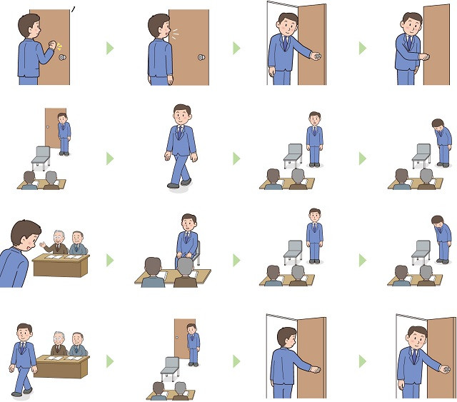 เมื่อถึงคิวคุณให้เคาะประตูห้องสัมภาษณ์ 3 ครั้ง รอให้ผู้สัมภาษณ์เรียกให้คุณเข้าไปว่า "どうぞ Douzo" แล้วจึงเข้าห้องไปแล้วกล่าวว่า
