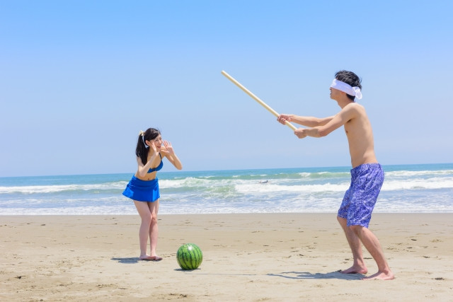 สำหรับใครที่วางแผนจะไปเที่ยวทะเลในญี่ปุ่นในช่วงฤดูร้อนก็ลองมาสนุกกับเกมส์สุดฮิตของคนญี่ปุ่นแบบอินเทรนด์ไปกับหน้าร้อน スイカ割り (Suikawari) ปิดตาตีแตงโมกันดูนะ