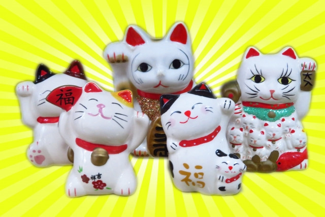 แมวกวักที่ยกมือขวาขึ้นบน ถือกันว่าจะช่วยเรียกเงินทองและโชคลาภมาให้อย่างต่อเนื่อง