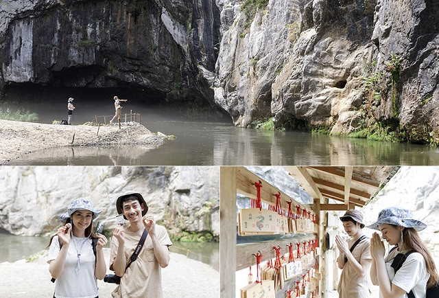 เรือจะไปจอดตรงที่ลองเสี่ยงทายหินหน้าผาใหญ่ หรือ โขดหินใหญ่โอเกบิอิวะ ที่จุดเลี้ยวกลับของการล่องเรือกัน เชื่อกันว่าถ้าขว้างหินเสี่ยงทายเข้าไปในช่องอธิษฐานซึ่งอยู่ตรงกลางโขดหินนั้นได้ คำอธิษฐานจะเป็นจริง หินเสี่ยงทายมี 10 ชนิด จะสลักอักษรคันจิที่มีความหมายว่าถึง โชค ลาภ สายสัมพันธ์ ความปรารถนา ความรัก ความใคร่ ลิขิต อายุยืนยาว ทรัพย์สมบัติ และ เงินทอง มีคำแปลภาษาไทยอยู่ตรงนั้น แต่ว่าเราต้องค้นหาหินเองนะ เสร็จแล้วนำไปจ่ายเงิน โดยจะจำหน่าย 5 ก้อนในราคา 100 เยน เราจะเสี่ยงทาย เรื่องอะไรกันดี และเมื่อโยนลงในช่องแล้ว ให้ไปรับการ์ดใบเล็กๆ ที่แสดงว่าเราได้โยนหินลงในช่องอธิษฐานแล้วจากผู้ดูแลตรงนั้น ต้องโยนลงจริงๆ ถ้าโยนไม่ลงไปเนียนๆขอเค้าไม่ให้นะจ๊ะ