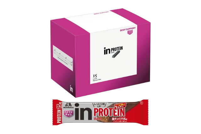 in โปรตีนบาร์ รสช็อกโกแลต จากโมรินากะ ผู้ผลิตอาหารและขนมเจ้าใหญ่ในญี่ปุ่นให้โปรตีน 15g ต่อแท่ง และวิตามินบี 7 ชนิดที่จำเป็นต่อการทำงานของโปรตีน