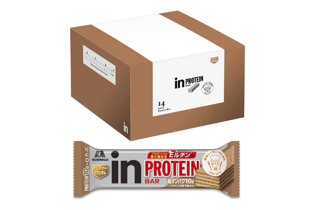 in โปรตีนบาร์ รสกาแฟ จากโมรินากะ ผู้ผลิตอาหารและขนมเจ้าใหญ่ในญี่ปุ่นให้โปรตีน 15g ต่อแท่ง และวิตามินบี 7 ชนิดที่จำเป็นต่อการทำงานของโปรตีน