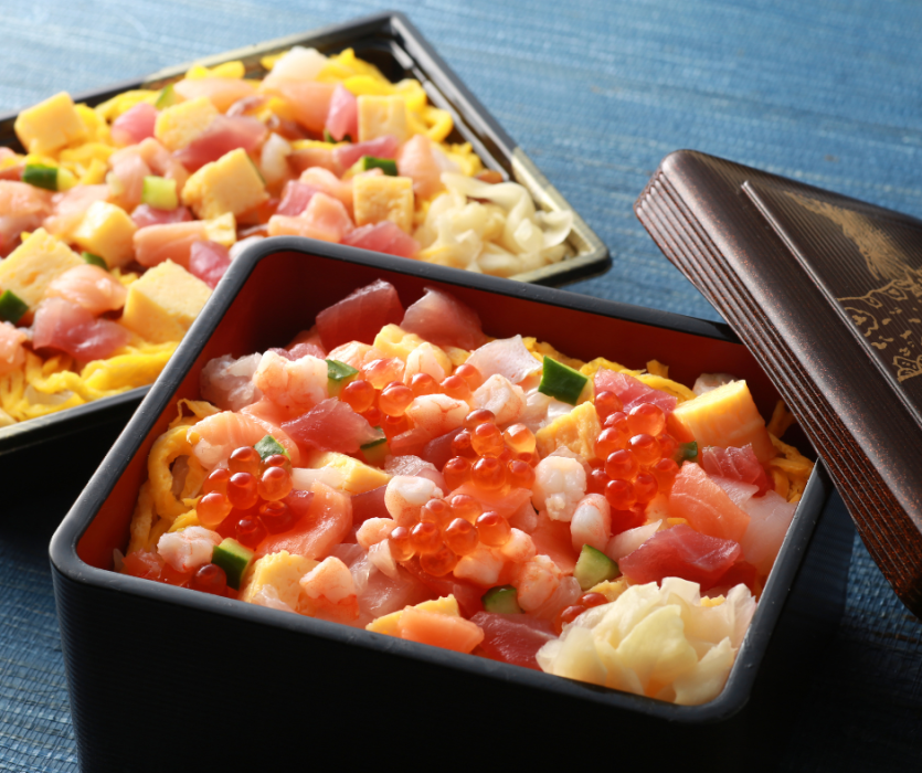 Chirashizushi là một món sushi phân tán, có nghĩa là các loại hải sản, trứng, rau củ và đồ trang trí được rải lên trên cơm trộn giấm. Chirashizushi thường được ăn vào ngày 3 tháng 3, là ngày Lễ hội búp bê Hinamatsuri để chúc phúc cho sức khỏe và hạnh phúc của các bé gái. Món ăn này có đầy đủ các loại nguyên liệu hải sản tươi sống, các loại rau củ và cơm, mang đến bữa ăn đầy đủ dinh dưỡng. Một số nguyên liệu phổ biến cho món Chirashizushi mùa xuân là trứng cá hồi, tôm, cua, trứng, đậu Hà Lan, củ sen, măng, nấm hương, hoa anh đào, v.v.