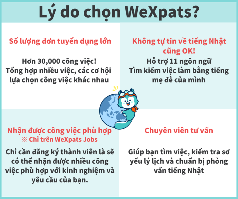 WeXpats Agent là dịch vụ hỗ trợ, chuyên cung cấp việc làm cho người nước ngoài sống tại Nhật Bản.