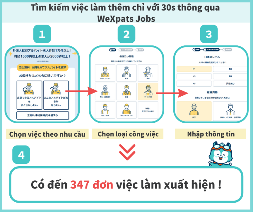 WeXpats Jobs là trang web việc làm bán thời gian dành cho người nước ngoài đang sinh sống ở Nhật Bản. Bạn có thể tìm kiếm việc làm bằng 11 ngôn ngữ (tiếng Anh, tiếng Việt, tiếng Hàn, tiếng Indonesia, tiếng Trung phồn thể, tiếng Trung giản thể, tiếng Miến Điện, tiếng Thái, tiếng Tây Ban Nha, tiếng Bồ Đào Nha), và cả tiếng Nhật. Tìm công việc phù hợp với bạn bằng cách lựa chọn trình độ tiếng Nhật, nghề nghiệp, địa điểm, v.v.