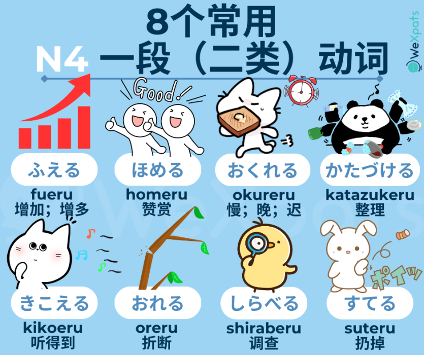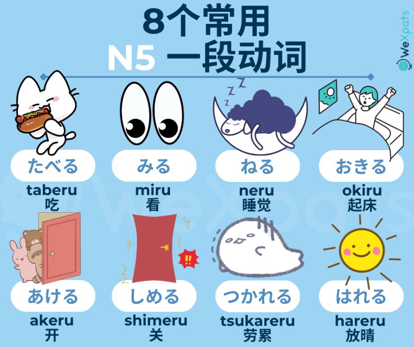当然,无论是自动词还是他动词,都离不开我们在N5阶段学过的动词分类范围,那么在学习N4必学一段(二类)动词之前,可以先复习一下N5一段(二类)动词哦!.