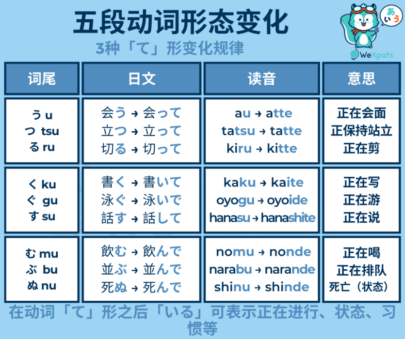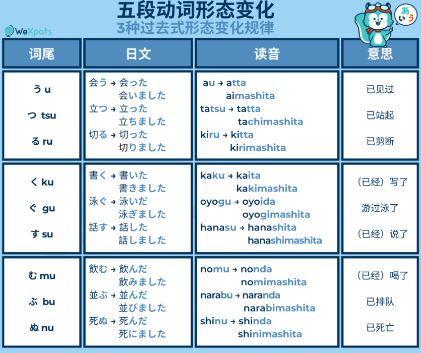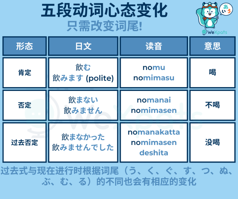 注:1.所有动词词尾都在「う」段上;2.词尾不是「る」的动词,肯定全都是一类动词;词尾是「る」的动词可以是一类,也可以是二类,还可以是三类。