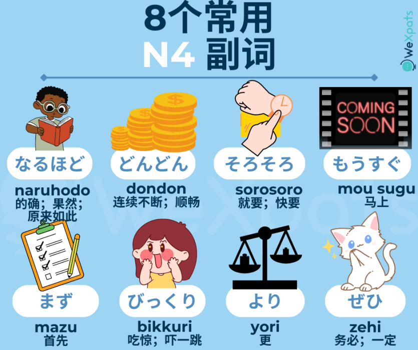 如果将日语副词分类的话,可以分为陈述副词,程度副词和(情)状态副词三种。忘记N5阶段必学副词的同学可以进行复习巩固一下哦:N5 阶段必须要掌握的副词清单。