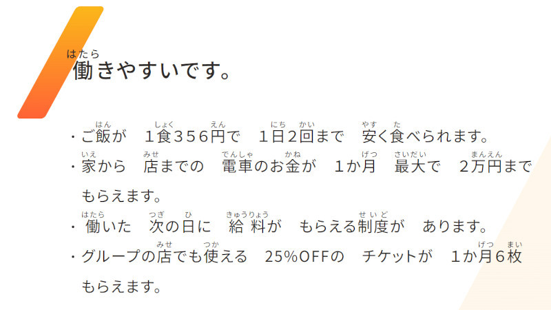 有的,比如刚才提到的招聘页面,是在咨询了外籍兼职员工意见后才进行的大幅改进。其实在页面刚公开时,我们自己感觉把所有内容都用平假名书写会更好。但是问过他们之后才知道对于他们来说“这样写反而更难懂”,所以才进行了改进,改成了现在的汉字加注音的形式。另外,像“交通费”改成了“从家到店的电车费”,把一些学校里的学习过程中不怎么使用的敬语改成了日常用语等等。