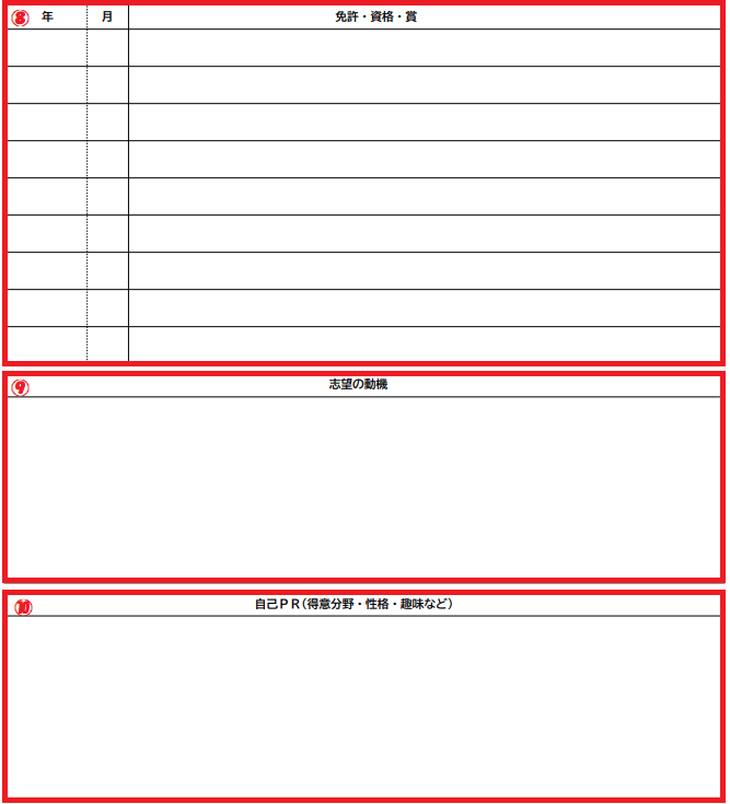 如果有很多项可以写,要按照从过去到现在的时间顺序来写。一般可以写的有日语等级考试、TOEIC考试、驾照这些。如果有和工作内容相关的技能一定要写上。学生时代比较出众的获奖记录也可以写。如果有近期内准备考取的技能证或者资格,可以标注“大学卒業時に取得予定”“〇月に取得予定”“取得に向けて勉強中”