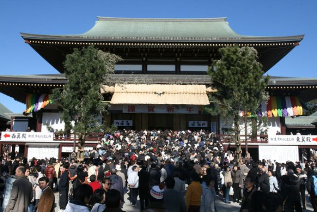 正月期间前往神社祈福是日本人重要的过年习俗。所谓初诣,即新年第一次拜诣祈福。原则上来讲,整个正月期间都可以前往神社进行初诣,但大多数人通常在新年的前3天前往。一些人气比较高的神社则从12月31日晚上就开始出现大量的人排队初诣。寺院则会在零点跨年的时候敲108下钟,即“除夜之钟”,以祈福消灾。初诣意义在于祈求在新的一年里自己的家人、伴侣、朋友以及自己能够身体健康,事业有成,学业进步等等,也可以说是日本人新年中最重要的传统习俗,重要程度丝毫不亚于中国“大年三十”的“年夜饭”。日本人要在12月31日守岁跨年,所以日本的电车都会破例在这天夜晚通宵运行,日本民众连夜去求初诣,只为了能够尽早在新年的第一天赶到神社参拜祈福,彰显自己相当诚恳的心,以及对新一年的无限憧憬。