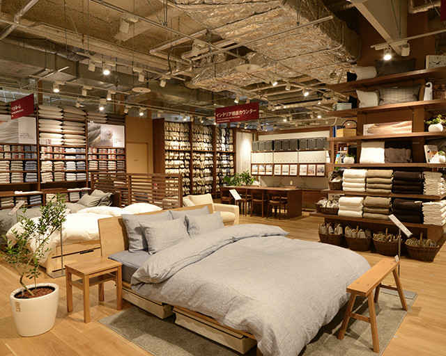 无印良品除了在产品和传播方式上重视自己一贯的表达风格,同时在店铺的空间设计上同样注入了相同的理念,让顾客在进入无印空间的一刹那就领会并融入到MUJI的世界中。在最早的西友百货无印良品售卖空间中,商品是按照品类摆放不同柜台。而田中一光改变了传统的售卖方式,提出了一个关键字“家”,就是从家的角度来研读空间。有了家的概念后,在无印良品的售卖空间中,都要传递“家”的信息。为了凸显这种信息,设计师把天花板吊顶全部去掉,让管道和水泥直接裸露,货架和墙面尽量使用原生态的木材、石头等天然材料,在各种漂浮生活气息的材料中摆放着无印良品的产品。