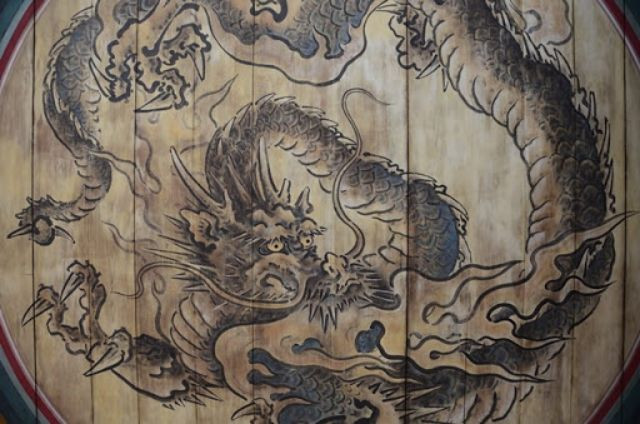 拜殿同样也是日本的重要文化财产。它位于地主神社的南侧,天花板的结构为镜天井的形式,和本殿一样,在日本也同样非常稀有。在镜天井中,还描绘有一条龙。不知道为什么,这条龙从任何角度看过去,都好像在回过来盯着自己一样,因此也被人们称作八方瞪龙,是清水地区七大不可思议的事件之一。