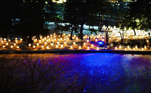 到了冬天,世界雪都就开始发挥天然优势了。每年2月中旬左右,当夜幕降临时可在弘前公园欣赏到夜雪樱的绝景哦!因为青森县的雪量很大,护城河沿岸的樱花树上压满了厚厚的积雪,晚上被粉色的彩灯打亮,就变成了梦幻般的雪樱世界,可谓是日本赏樱独一份了!与此同时,弘前公园还会举办雪灯笼节,大家一边赏雪樱一边在雪灯笼中漫步,享受着青森独有的冬日浪漫。