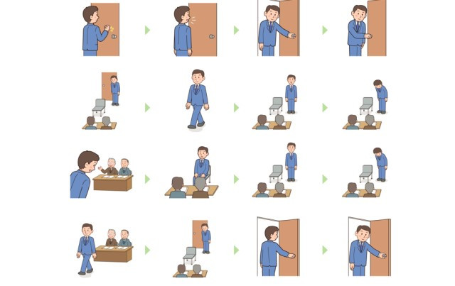 站起來,把椅子調回原來的位置,向門口鞠躬並說「失礼します。」 在離開房間後,再次輕輕地把門關上。在離開大樓之前都要注意禮貌,確保不會遇到其他員工(也許是你未來的同事)。