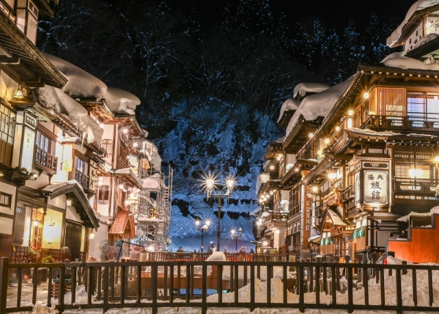 銀山溫泉從12月到3月中旬會積雪,在晚上可以欣賞到煤氣燈照亮溫泉街懷舊而美麗的街道。