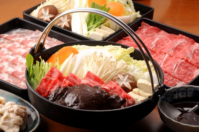 壽喜燒是以淺鍋來煮肉和蔬菜,如豆腐、日本葱、白菜和香菇,配合醬油、味醂、清酒、糖和水混合的湯汁烹煮。而且會把熟肉蘸生雞蛋來品嚐。