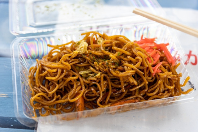雖然日式炒麵的日文名字中有蕎麥麵,但炒的其實是中華麵條,搭配切成薄片的捲心菜和胡蘿蔔和肉。炒麵有兩種調味,鹽或醬汁,前者較乾而後者濕潤又濃郁,再加上紅薑、蛋黃醬和柴魚片。