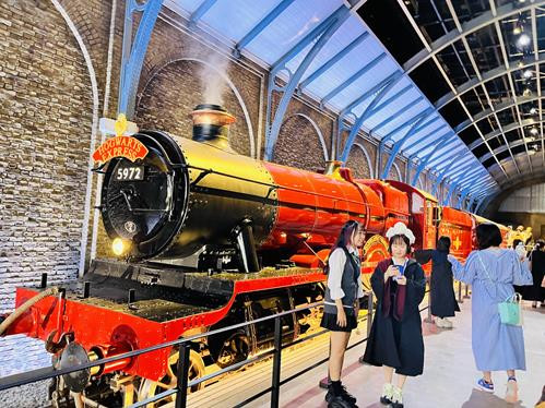 在電影中,作為魔法世界的入口,學生們推著手推車穿過國王十字車站的9又3/4站台, 月台上停靠著前往霍格沃茨的特快火車。設施中也會重現這個經典場景,讓客人感受到其規模之大。當中展示的霍格沃茨特快列車是一輛在1929年製造、曾在英國運行的蒸汽火車,改裝過並運抵日本。