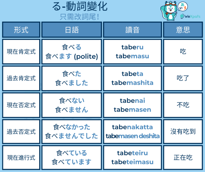 變化規則很簡單,只需改變結尾即可。以下是一個る動詞的變化形式的例子。 「調べる(shiraberu)- 調查」是一個る動詞,過去式變成「調べた(shirabeta)- 調查過」。