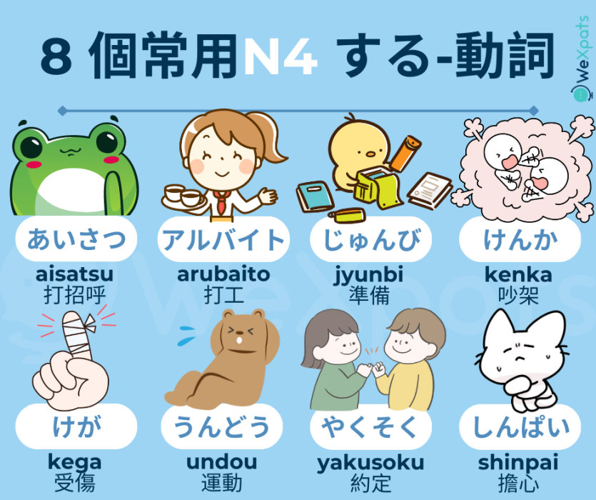 已經學完了N5級基本動詞和不同動詞組的變化形式嗎?那麼是時候學習更多的日語動詞,以通過N4 JLPT考試了!這次總共有225個N4程度日語動詞,雖然數量有點多,但學習完定會讓你日語能力大進步,一起加油吧!