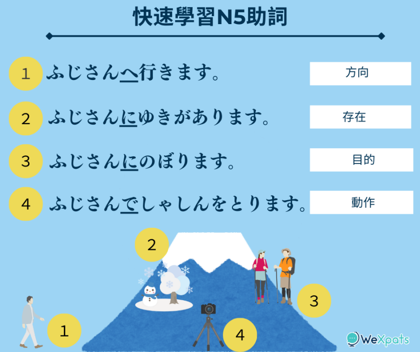 以下清單總結了 JLPT N5 中常見的日語助詞。同一個助詞可能有不同的用法,也有些非常相似,因此我們建議記著例句避免混淆。