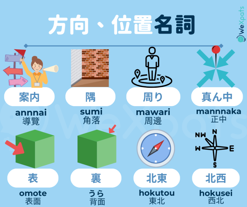 在景點導覽或問路時,搞清楚自己的所在位置或方向非常重要。中文一般以「東南西北」表達四個基本方位,日語中也有「東西南北」(touzainanboku)的類似說法,除了指四個方位,也有來自四方八面的意思。而在說到方位組合時,順序和中文相反,例如中文的「東北」在日語以「北東」(hokutou)來表示。