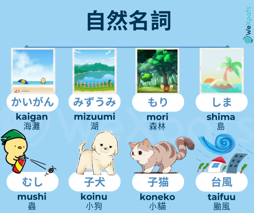 請注意,許多N4名詞會與N5名詞重複,為免重複學習減輕負擔,我們因此在文章上會省略。但是,我們保留了一些(極少數),純粹是為了幫助你理解特定的N4名詞。例如,「犬」和「猫」是N5名詞,會包含在下面的自然類別中,以幫助你理解它們與N4名詞「子犬」和「子猫」的區別。