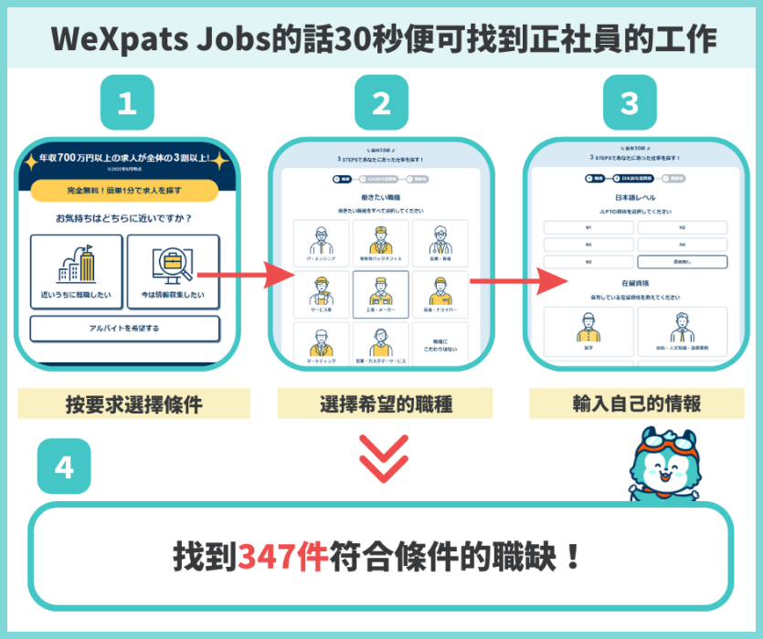 根據你的日語水準、職業類別、工作地點等指定條件,挑選適合你的職缺。