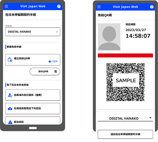 在「Visit Japan Web」可辦理「入境審查」、「海關申報」和「免稅購買」的網上服務。入境日本後,在網頁中選擇「建立免稅QR碼」,提前讀取護照及貼在護照上的上陸許可證印便可生成QR碼。在能接受QR碼的免稅店掃描QR碼(不可使用屏幕截圖)即可購物,無需向店員出示護照,更加方便。