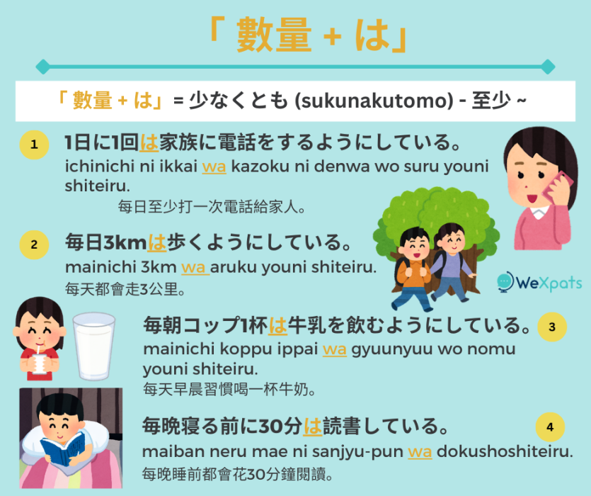 N3級別的助詞「は」(wa),當與數量相結合時,表示「至少(at least〜)」的意思。在表達習慣或執行的行動時常常使用。請注意,與名詞主語相連接的「は」與「私は」等不同,意義也不相同,請注意區分。