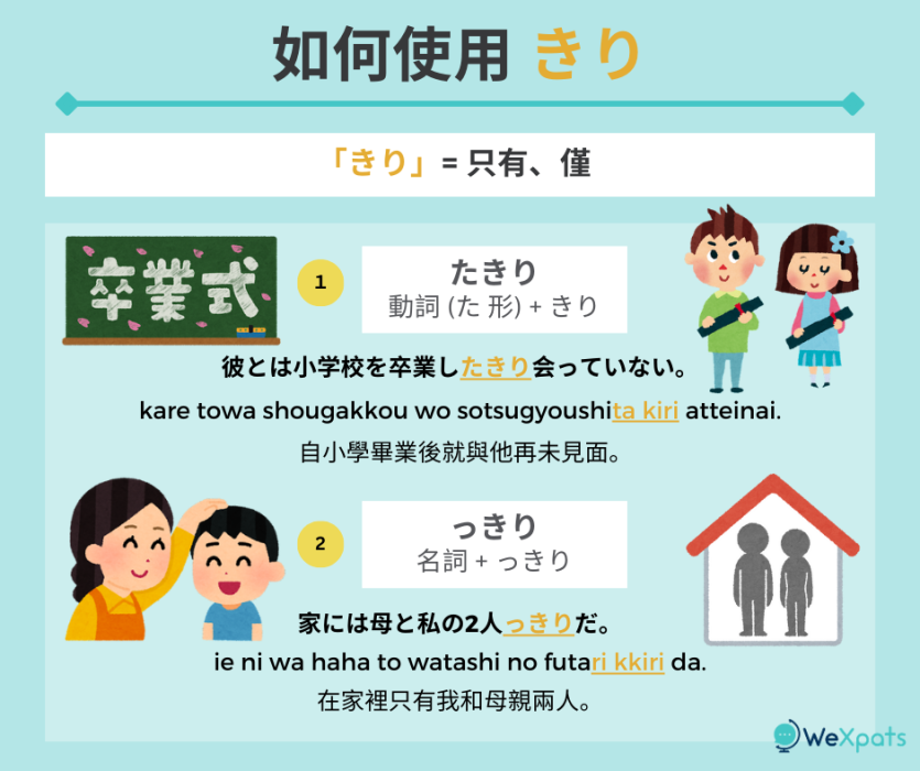 對於N3級別的助詞「きり(kiri)- 只有、僅、~之後」,它的意義是限制它附加的詞語的範圍。它也用來解釋自「きり」出現的點之後到現在的有限情境範圍。