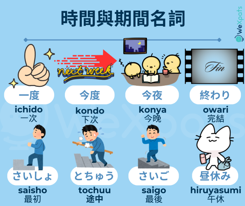 這些名詞用於描述事情發生的時間或時機。它們在日常對話和書面表達中很常見,所以要牢記它們。
