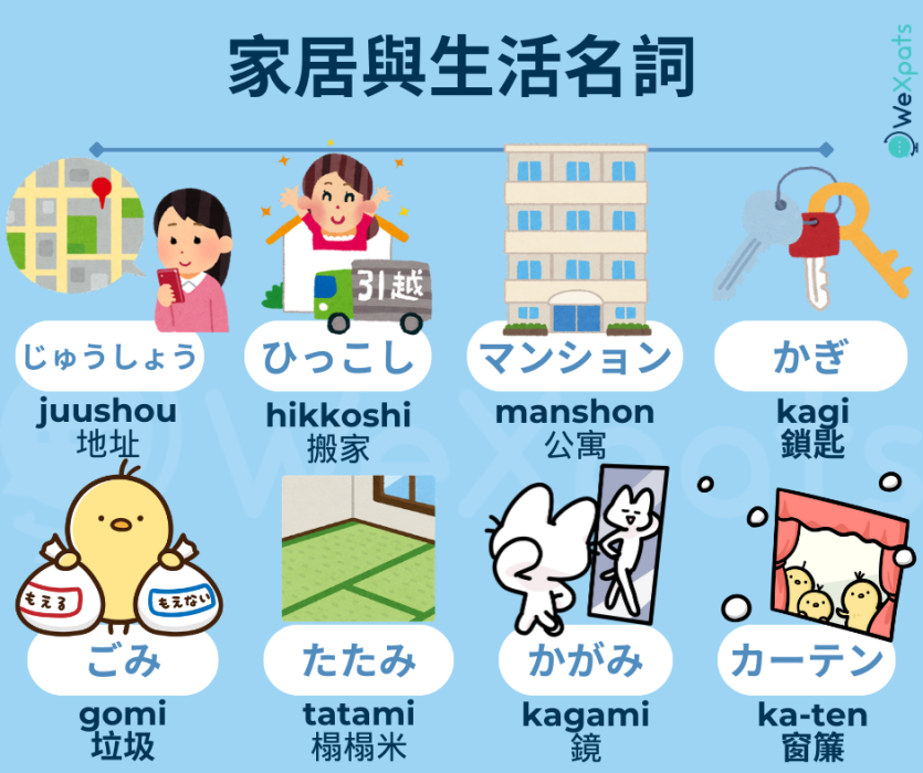 這些名詞與「家庭與生活」相關,最適合用來描述你的家和居住狀況,或是談論家裡熟悉的事物,有助於你用日語處理住所中的問題和提出請求。