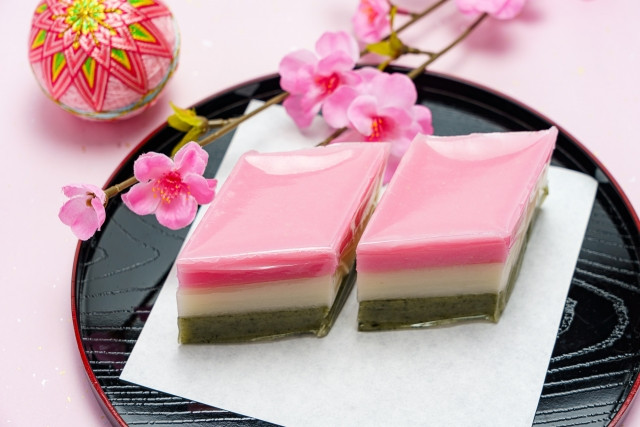 菱餅由紅色、綠色和白色三層菱形糕餅堆疊而成。菱形在古代是象徵著成長和繁榮的符號,而三種顏色也蘊含著意義,紅色代表「驅邪」,白色代表「純淨」,綠色則象徵「健康」。