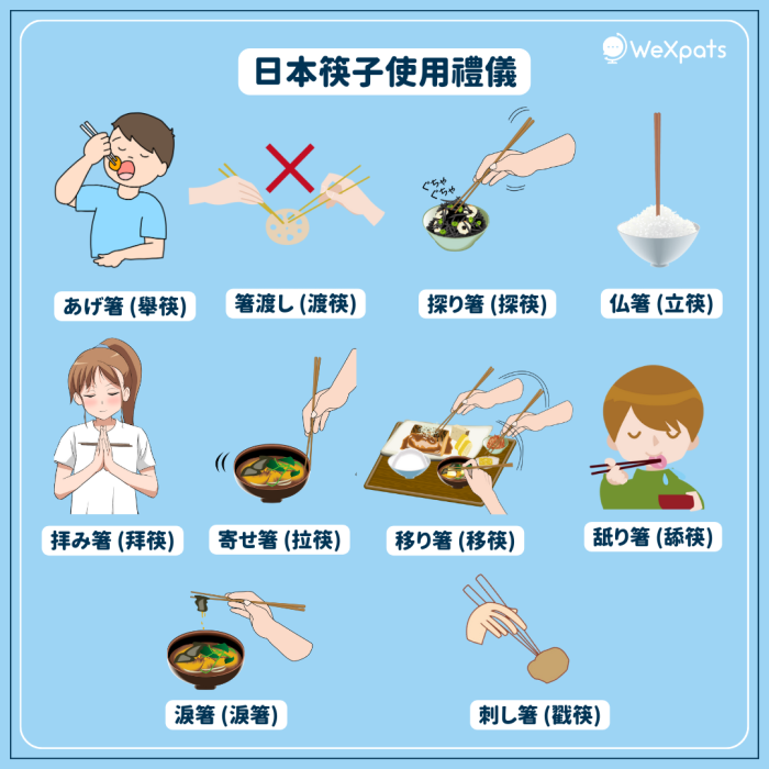 移り箸 (移筷) - 指在同一道菜上多次使用筷子。正確的禮儀是先吃飯,再吃配菜,再次吃飯,然後吃另一道配菜。(會注意這一點的人是少數)